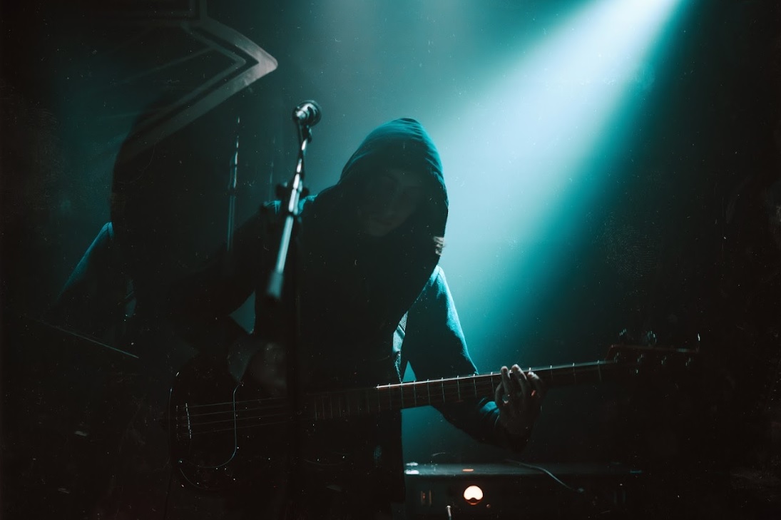 The musicians take to the raised stage and this time around the stage lighting is very much used sparingly, with only eight circle lights on the rear of the stage which backlight the trio and so they are coming at us out of the dry ice and darkness. In essence they are shadowy creatures hiding in plain sight, with hoodie’s raised where possible. Our photographer, David Gyokos, has certainly got his work cut out this evening!