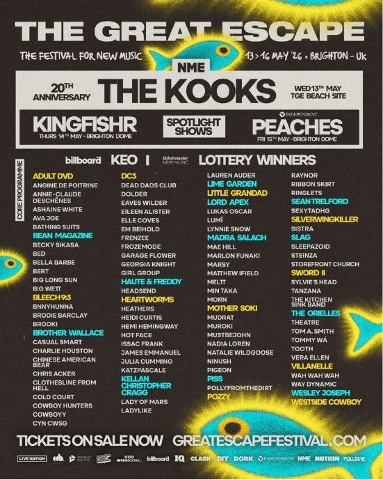 Luke Pritchard, The Kooks said: “Brighton always feels like coming home in a way no other city does. The Great Escape is special because it’s fundamentally about music happening in rooms where you can feel people breathing. There’s something really powerful about when the distance between the band and the crowd just disappears. It always takes us back to the beginning and why we started this in the first place. I hope people leave feeling like they caught something rare, we can’t wait to see you there!”