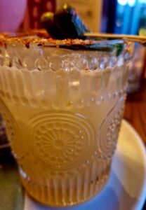 On first sip, I actually laughed out loud and my companion asked me what that meant. It meant that there were multiple layers of tasting, that I could indeed, taste the pickle juice, but also all of the other carefully matched flavours too. It was quite a surprise to have that level of depth in one drink but it really blew my socks off. Having never heard of Tajín, I’m off to buy some for my own kitchen, because the seasoning alone is a taste sensation.