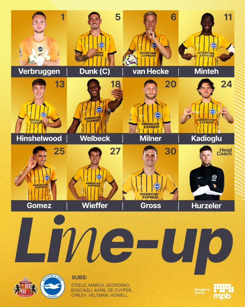 Danny Welbeck and James Milner are back, as is Yankuba Minteh, but Carlos Baleba and Kaoru Mitoma are out and Georginio Rutter and Olivier Boscagli are on the bench.