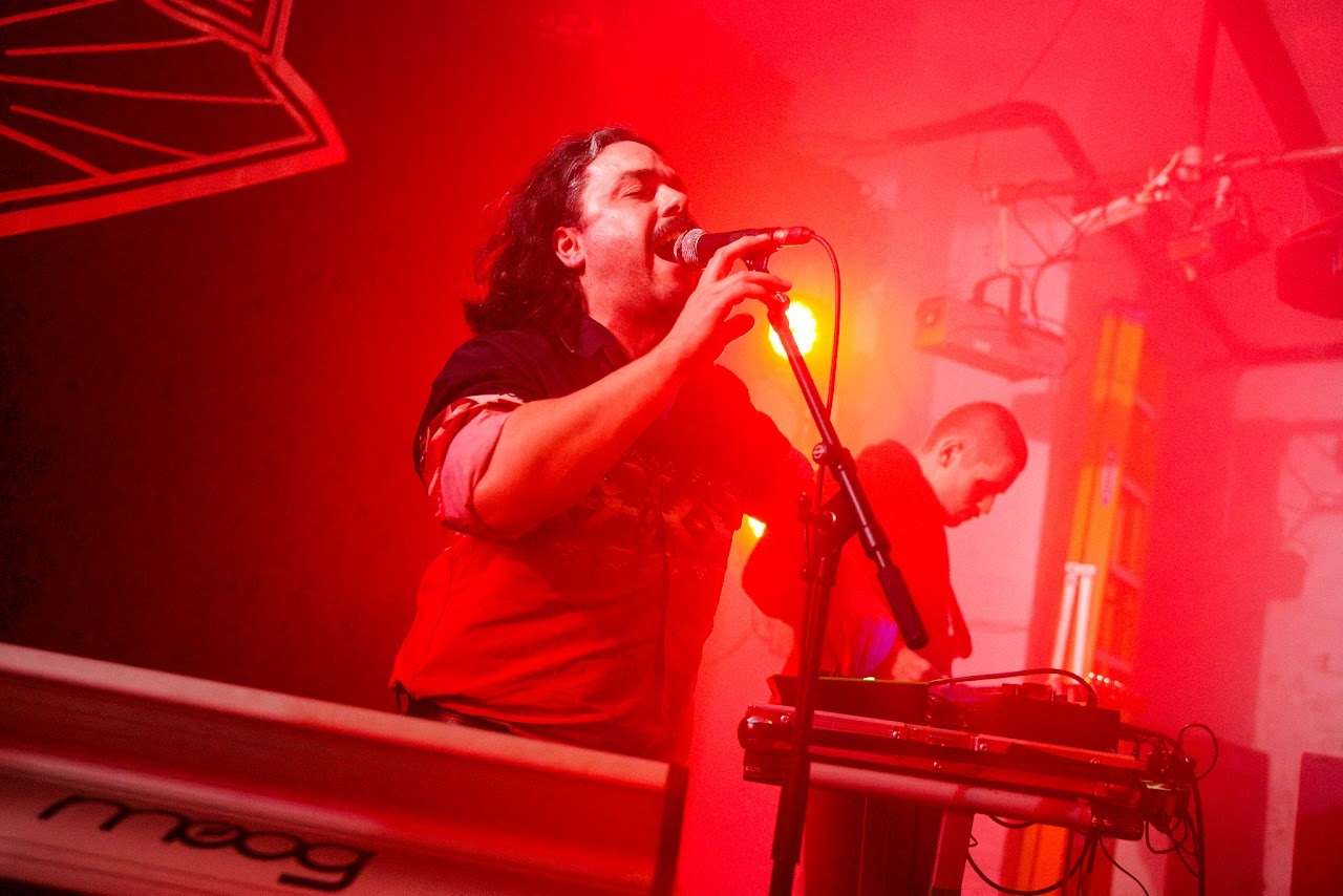 The next offering is ‘Big Shoes’ which immediately sees Emmet’s screamed vocals in action from the off which are accompanied by wonderful thudding beats, which fall into more Nitzer Ebb and Front 242 territory. There’s also a synth section from George which is vintage Gary Numan a la screaming synths as well. The standout line here being “Smiling through the keyhole”. There’s more industrial sounds and shouty vocals up next with the performance of their 2024 single ‘Call’, which has the addition of acid house bleeps-a-plenty. It’s time for another newbie, this time it’s ‘Dr. Crow’ which has a stark ‘Blue Monday’ (New Order) beat, which builds and builds as Emmet says “inside” and “outside”. ‘Friction’ is selection eleven and this has dirty gritty vocals along with a slow pounding Nine Inch Nails (and latter day Gary Numan) style beat. It reminds me of when the Belgian New Beats used to rule the clubs with their 33RPM sounding tracks, that I always desperately wanted to speed up to 45RPM. There’s some trademark chest thumping from Emmet here as he psych’s himself up further.