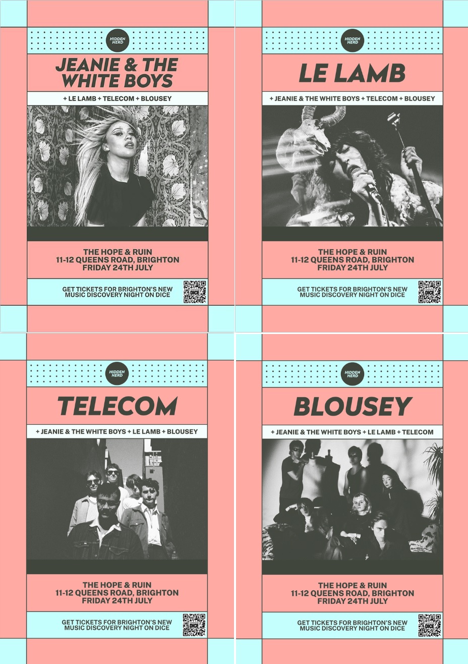 Hidden Herd Presents is Brighton’s new music discovery night, spotlighting the most exciting emerging artists, ones-to-watch and hidden gems. On Friday 24th July the event will be going down at The Hope & Ruin and will feature Jeanie and The White Boys, Le Lamb, Telecom and Blousey.