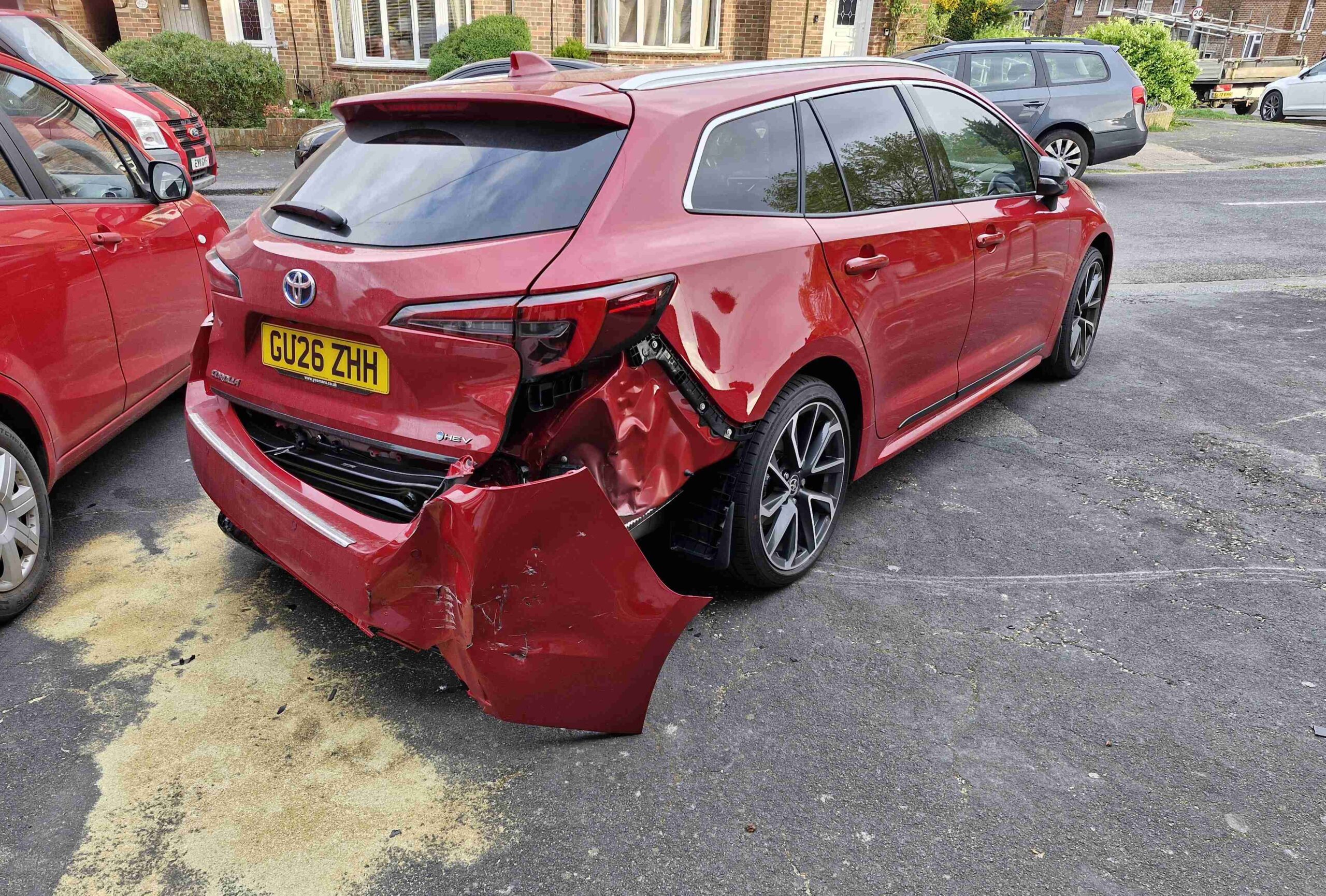 The parked car that was damaged in the crash was a red Toyota Corolla Excel that was first registered less than three weeks ago and sells for about £37,000.