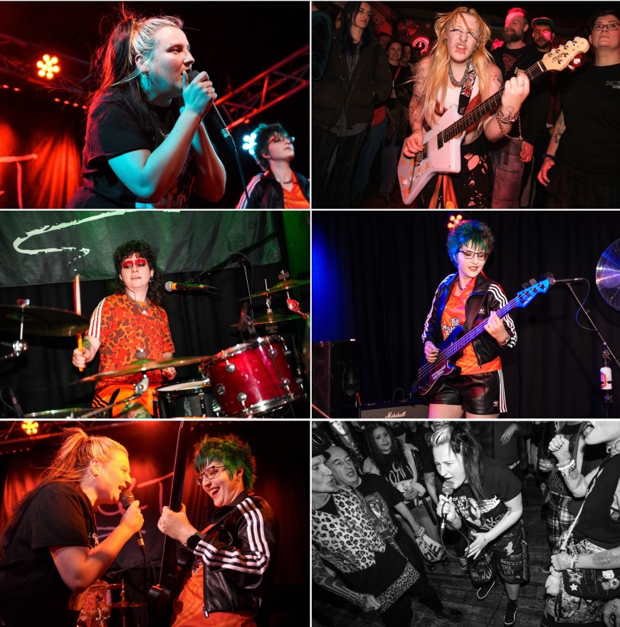 Another new band for me, although their name does ring a bell, but I can’t put my finger on why. The Menstrual Cramps are a 4 piece band from Bristol, described on their Bandcamp page as: “QUEER PUNK BAND, SMASH THE FASH”. The four piece consists of Emilia Elfrida on vocals, AJ on drums, Rat on guitar and Oana on bass. The first thing that struck me as they took to the stage is how damn cool they all looked, dressed in a variety of custom made orange and black outfits, orange is my favourite colour, it must be a sign, instantly I got the vibe that this band and set are going to be fun all the way.